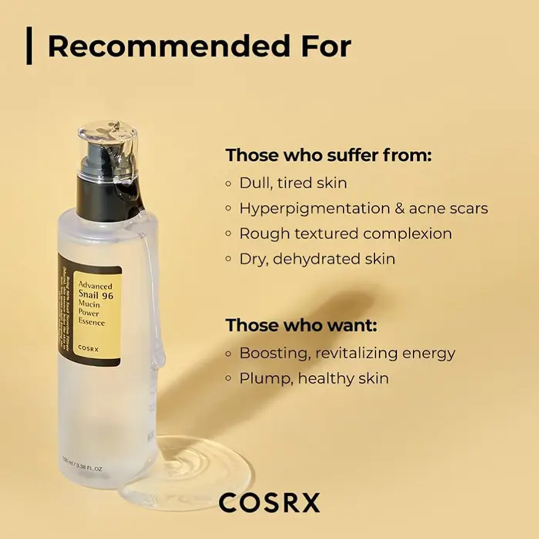 The Real Snail Essence: Formulated with 96.3% Snail Secretion Filtrate, this essence repairs and rejuvenates the skin from dryness and aging. It improves skin vitality by reducing dullness and soothing dehydrated skin.